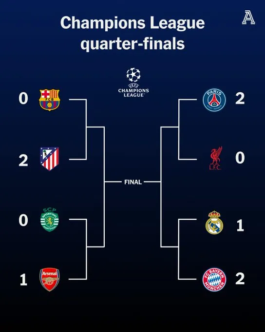 欧冠1/4决赛首回合4场比赛主队1胜3负,仅巴黎捍卫主场